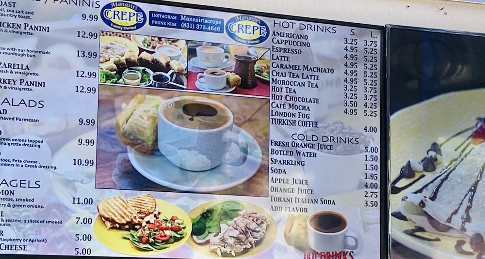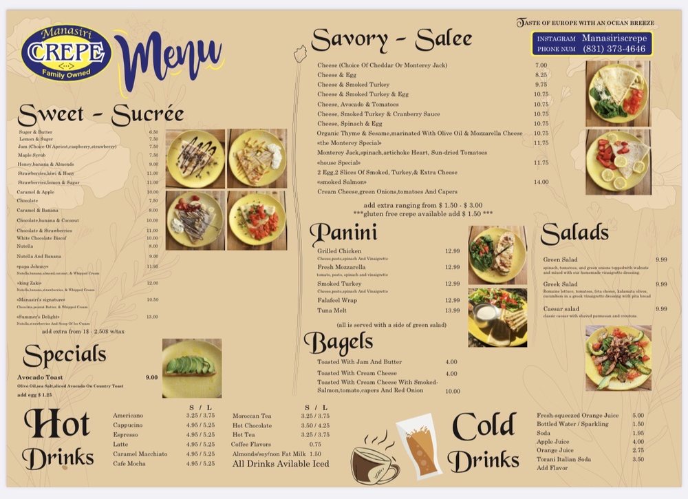 Introducing Manasiri’s Crepes, a cozy Turkish creperie in Monterey offering a wide variety of both savory and sweet crepes. Their menu includes options such as Cheese and Spinach, Chocolate and Banana, and Nutella with strawberries and bananas. The crepes are known for being delicious and generously sized, ideal for sharing or enjoying solo. Customers rave about the friendly staff and comfortable atmosphere, making it a perfect spot for families, friends, and couples. The restaurant also caters to dietary needs, with gluten-free options available. With indoor and outdoor seating, free Wi-Fi, and a selection of board games, Manasiri’s Crepes provides a welcoming and enjoyable dining experience. Whether you're in the mood for a savory brunch or a sweet treat, this creperie is a must-visit in Monterey.